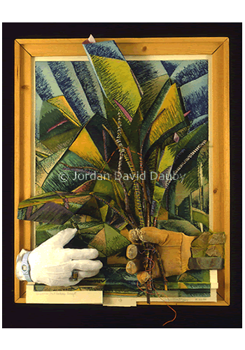 Handcolored etching construction with wood, gloves, stick, wire & stone