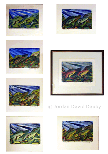 Re-examined former work which was printed with 3 zinc plates. For this series in variations, one plate or another was used per print with additional hand coloring added with color pencils while at my travel trailer in central Wisconsin in late Summer and early Fall of 2005. |