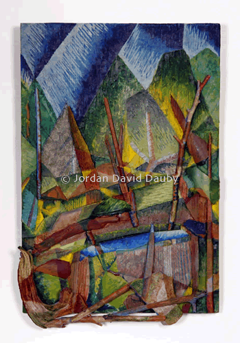 The wood block used for printing the work “First Cut” in reduction method was used as the foundation for this three-dimensional work. In addition to actual fragments of wood block prints sealed in acrylic polymer to what remained of the board are twig, stick and wood segments, broken ceramic pieces, small plastic paint brush handle, a broken flattened pencil found in a parking lot, stone, plastic and glass fragments and a bent rusted tube. All items are individually sealed in polymers before adherence and acrylic paints were used as well. |