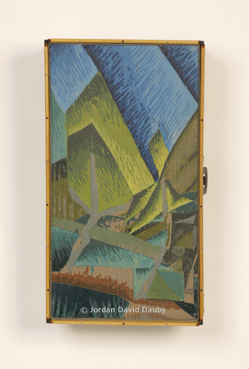 I realized that if we continue to attempt to separate ourselves, knowingly or unknowingly, from our connection with nature, then my collected items may very well become relics of past things no longer found. Actually begun while I was working upon “Home,” (now Opus 70); this work was completed first. With “Home” and this work, I found a means to use my abstract landscape style together with realistic natural items while also beginning a presentation on recycling and nature preservation. In addition to the reuse of my wood block print; “First Cut: Reprise (Nature Memory Box #1)” is made of a wood wine box, bands of a wooden table placemat, sewing pins, as well as cloth braid and fabric remnants. All items from nature are sealed in varnish or acrylic polymers.