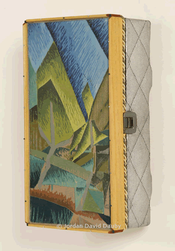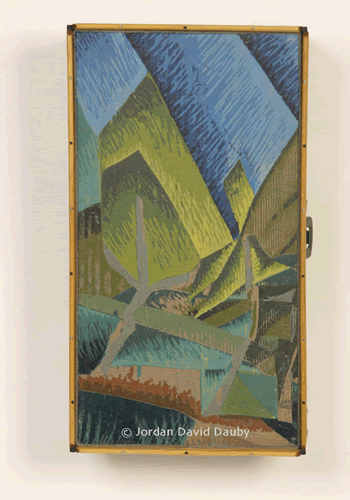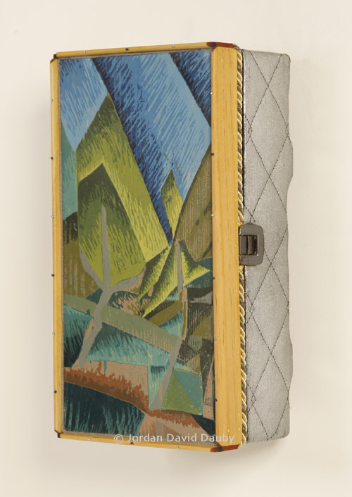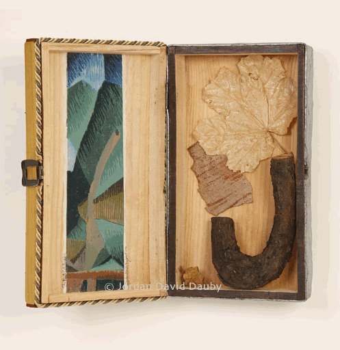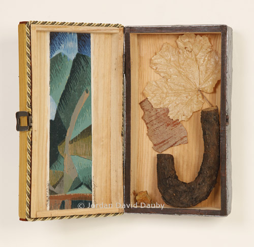 Elements used in my Nature Box Series of Scape Constructions are recycled and reused, including my own art works. Two sections from “The First Cut” find new expression in this work to ‘decorate’ the outside and inside of this recycled wine crate. I wanted, in some manner, to highlight and protect items I’ve collected from nature. They are as if ‘relics’ of nature housed in a reliquary, much like precious things of an important or holy person have been treasured in numerous religious traditions.