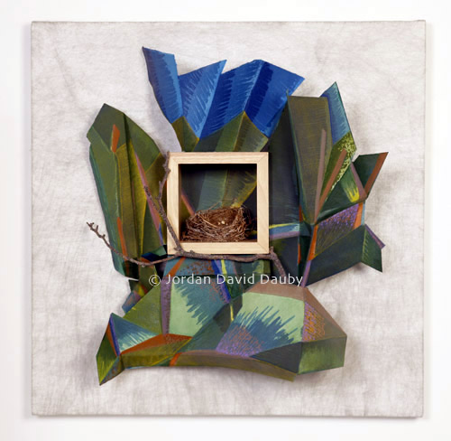 It was equally becoming apparent to me that if we continue to abuse, neglect and overuse nature, such collected remnants might very well become ‘relics of nature,’ and my decorating of them might be seen as reliquaries in some manner. Hence began my ‘Nature Memory Box’ series and works like this one which is simply called “HOME.” Here a bird nest, presented within a simple open box held by a branch fragment, is decoratively surrounded by folded sections of a lithograph and serigraph combination to which has been added acrylic paint and washes. I chose a fibrous fabric stretched over canvas to balance the background with the bird nest.
