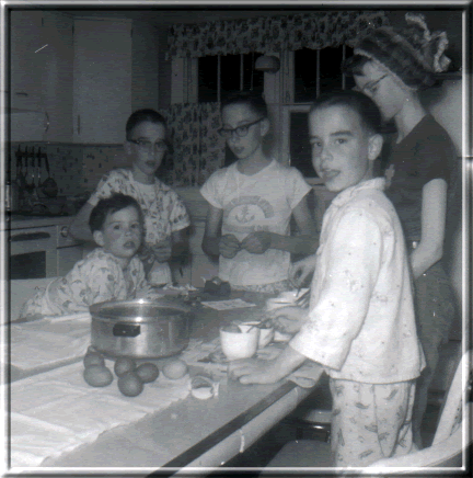 I'm second from the left, coloring eggs with my siblings; learning chemistry and color theory at age ten.